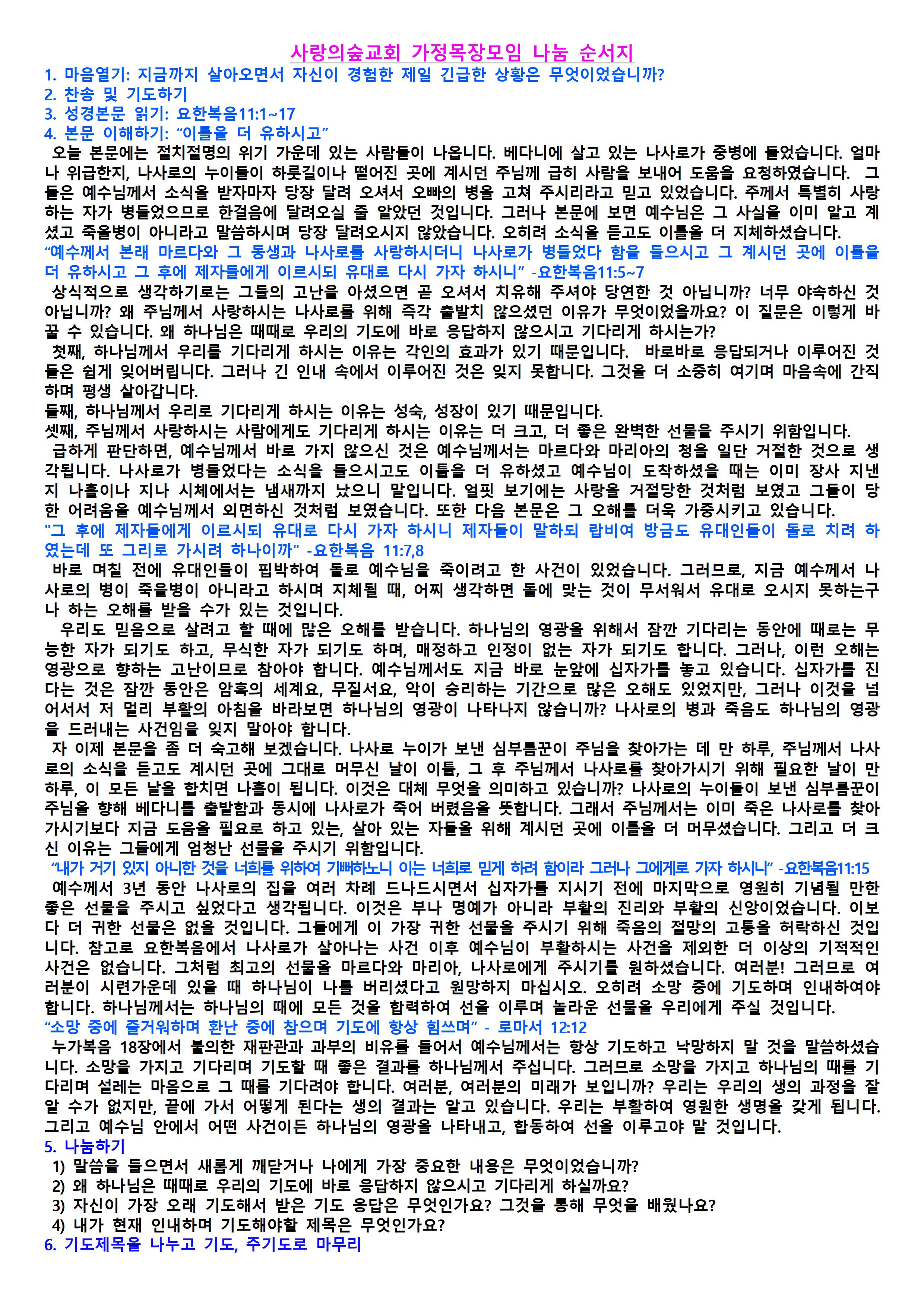 가정목장 모임, 예배 순서지입니다.